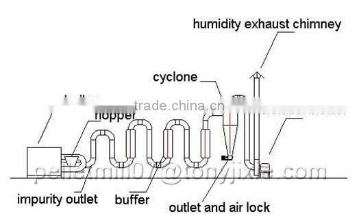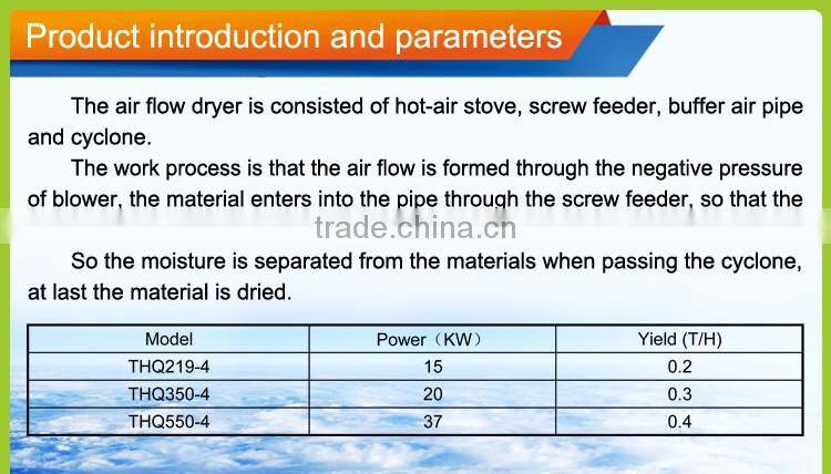 The air flow is formed through negative pressure of blower. Material enters into pipe through screw feeder, so that hot air and material mix together. Then moisture is seperated from materials when passing cyclone.