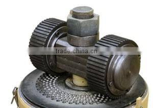 2)The two roller twirls continuously to press and grind the raw material.