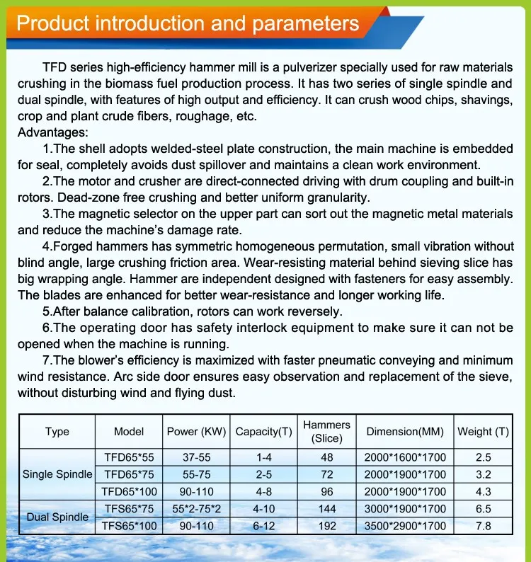 TFS Series wood chips hammer mill grinder is a pulverizer specially used for raw materials crushing in biomass fuel production process.It can crush wood chips,shavings,wood,leftover bits and pieces,roughage,etc.