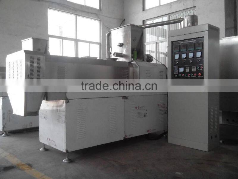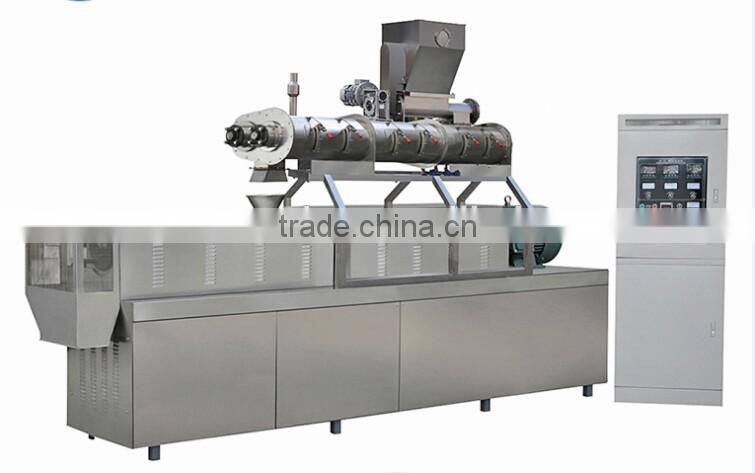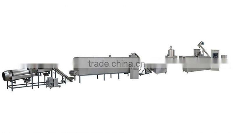 AutomaticTextured soya protein food production line Textured soya protein food machinery Textured soya protein food extruder Textured soya protein food processing line is suitable for producingTextured soya protein food in all shapes. It is widely used with a high temperature soybean flakes and as basic raw material, with a dry twin-screw extrusion machine, through strong squeeze instantaneous puffing, shaped different shapes soya food material ,After drying and surface seasoning coating ,its shaped all kinds of soya protein food finally .