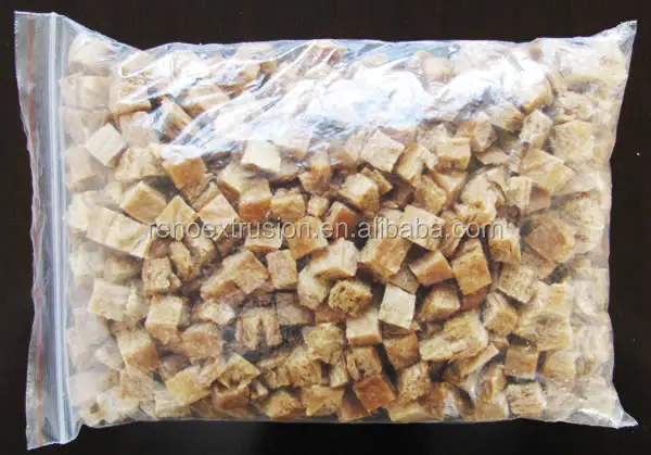AutomaticTextured soya protein food production line Textured soya protein food machinery Textured soya protein food extruder Textured soya protein food processing line is suitable for producingTextured soya protein food in all shapes. It is widely used with a high temperature soybean flakes and as basic raw material, with a dry twin-screw extrusion machine, through strong squeeze instantaneous puffing, shaped different shapes soya food material ,After drying and surface seasoning coating ,its shaped all kinds of soya protein food finally .