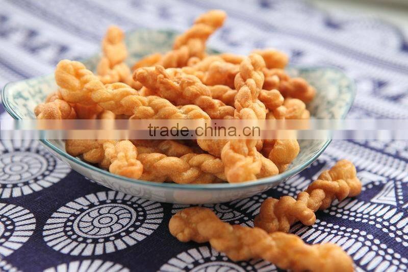 Automatic fry dough twisty machine twisty food production line twisty dough frying line twisty food extruder is suitable for producing dough twisty food in all shapes and length. It is widely used to produce the wheat dough twisty food .