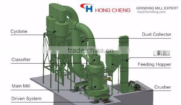Hongcheng HC-series, R series grinding mill production line consists of the feeding hopper, feeder, main mill(grinder), classifier, cyclone collector or pulse filter, pipes, fan blower, discharging valve and electric control cabinet.