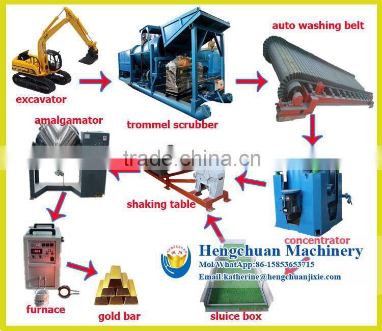 Excavator Load Raw Material to Plant Hopper Feeder Bin—>Rotary Scrubber—>Trommel Screen—>Pulsating Sluice —>Concentrator—>Shaking Table—> Amalgamator —> Mercury Distiller—>Gold Furnace