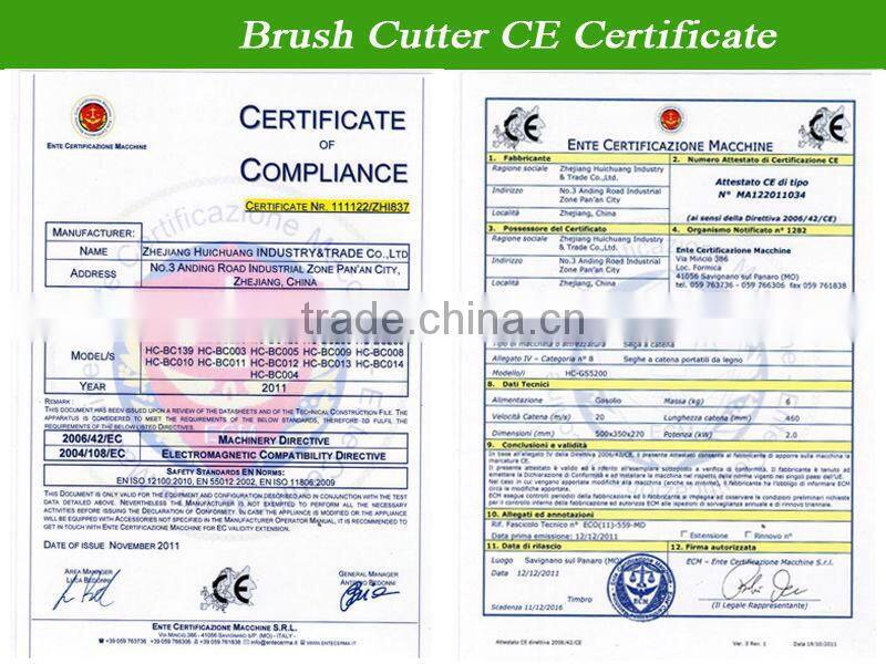 ZHEJIANG HUICHUANG INDUSTRY&TRADE Co., Ltd located in Yongkang city, Zhejiang province, is a professional garden machine manufacturer in China. Now our factory have more than 200 experienced workers and a 40-technician team, equipped with advanced testing machines and assembly lines, products include chain saw, brush cutter, generator, tiller, earth auger, etc. All of our products have achieved CE certificate.