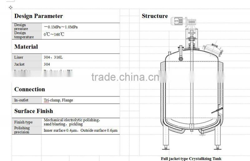 Crystallizing Tank be designed, manufactured and inspected in accordance with the pressure vessel standard (GB150-2011) and the steel welded atmospheric pressure vessel standard (NB/T 47003.1-2009) , strictly meet to GMP certificate requirements.