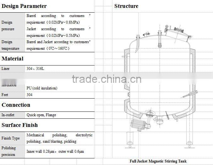 • Jacket can pass steam (or hot water), can also pass the cooling water. Jacket has disk tubular, full jacketed and Maitreya plate. Jacketed outside covered with insulation, thermal insulation material for rock wool (warm) or PU (cold).