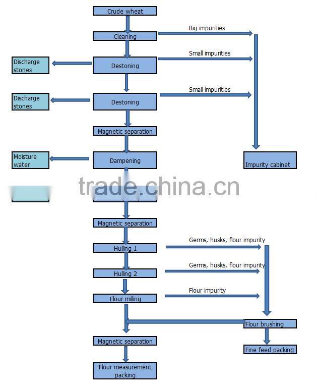 The wheat flour making equipments uses sieves and destoners to get rid off the medium and small impurities, such as dust, iron impurity and etc. Then the raw material will be hulled and polished by hulling and polishing machines. Thirdly, the material will be milled integrity into flour and germ by electric or pneumatic mills. Lastly, the flour will be screened to grade flour and be packaged automatically. The packaging step could design according to customers’requirement.