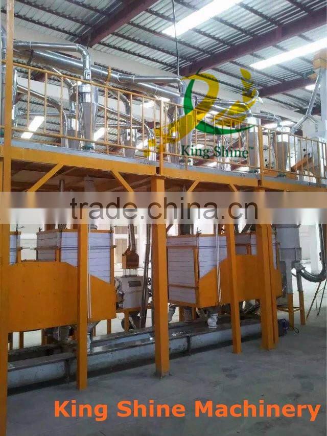 This production line adopts two-layer steel frame structure with continuous operation. The cleaning section adopts two sieving, two scourer, one destoner, one washing, two magnetic separating and etc technologies. All the elevators adopt bucket elevators greatly increase the production efficiency; meanwhile, decrease the power consumption extending the lifetime of the equipment. Milling section adopts milling bran and core respectively, and the following milling equipped with flour brusher which is a new technology. This production line could produce two kind of flour which is adjustable according to requirement.