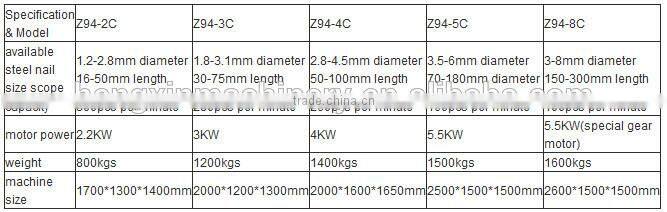 Originally it is designed to make common wire nail , but testing proved that , under the help from other special auxiliary equipments like corrugated nail machine , umbrella head making machine ,galvanization machine, thread rolling machine and etc .,also are okay for screw steel nail , roofing nail and cement nail(require high carbon 45# steel)