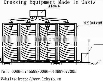 BLL spiral chute is to make separation of useful minerals from gangues by use of the different particles subject to gravity, hydraulic pressure and friction in the multi-force field through dynamic centrifugal flowing membrane of slurry produced on the inclined surface of spiral based on the difference of useful mineral and gangue in specific gravity , particle size and shape. Water in the spiral chute runs downward spiral movement and also flows in circulation transversely. Water in the upper layer run fast,generating centrifugal force with large inertia to toss toward the outer edge of the chute . Pulp in the heavy mineral grains settling faster convergence along the spiral gradually inward edge of the end, the form of concentrates produced. Light mineral deposition slowly, at a surface mine flow, velocity fast, centrifugal force, sub-ah horizontal circulation under the effect of gradually expanded along the line gradually moved towards the outer edge of the spiral, the end, the form of tailings output.