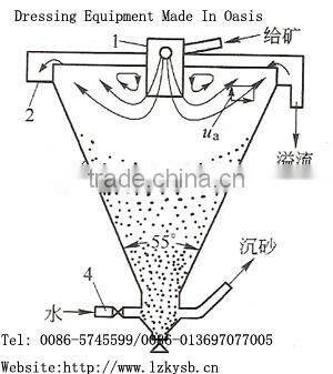 Sub-bucket is a simple mud cone grading machine, its external behavior of an inverted cone, in the liquid center is equipped to the ore bins at the bottom of the cylinder a certain depth below the liquid level. Pulp into the center along the tangential direction to the cylinder is through the buffer after the bottom of the outflow. Out flow to the periphery of the pulp radial flow to the overflow weir. In this process, the process of settlement increased faster than the speed of the coarse particles will be submerged in the tank, and discharged through the bottom of the Spigot approved. With fine-grained surface of the pulp into the overflow tank, as the overflow discharge. To the ore particle size generally less than 2mm, grading granularity below 74um.