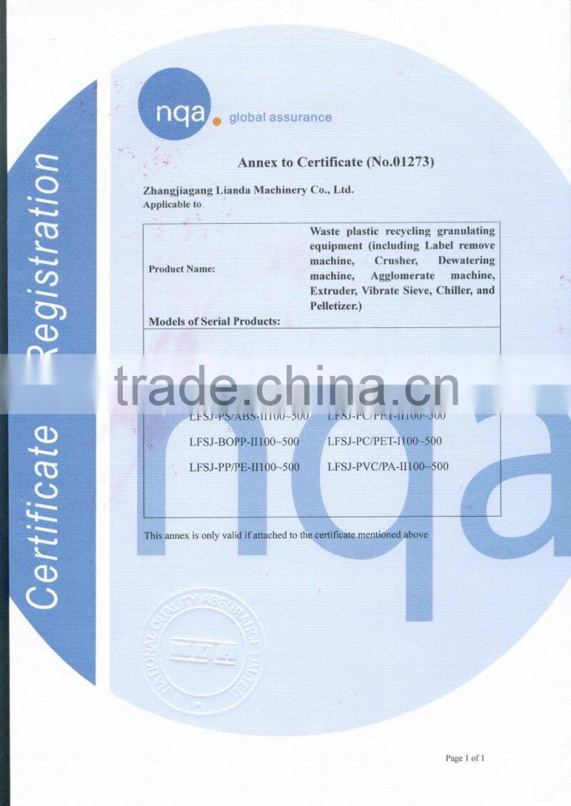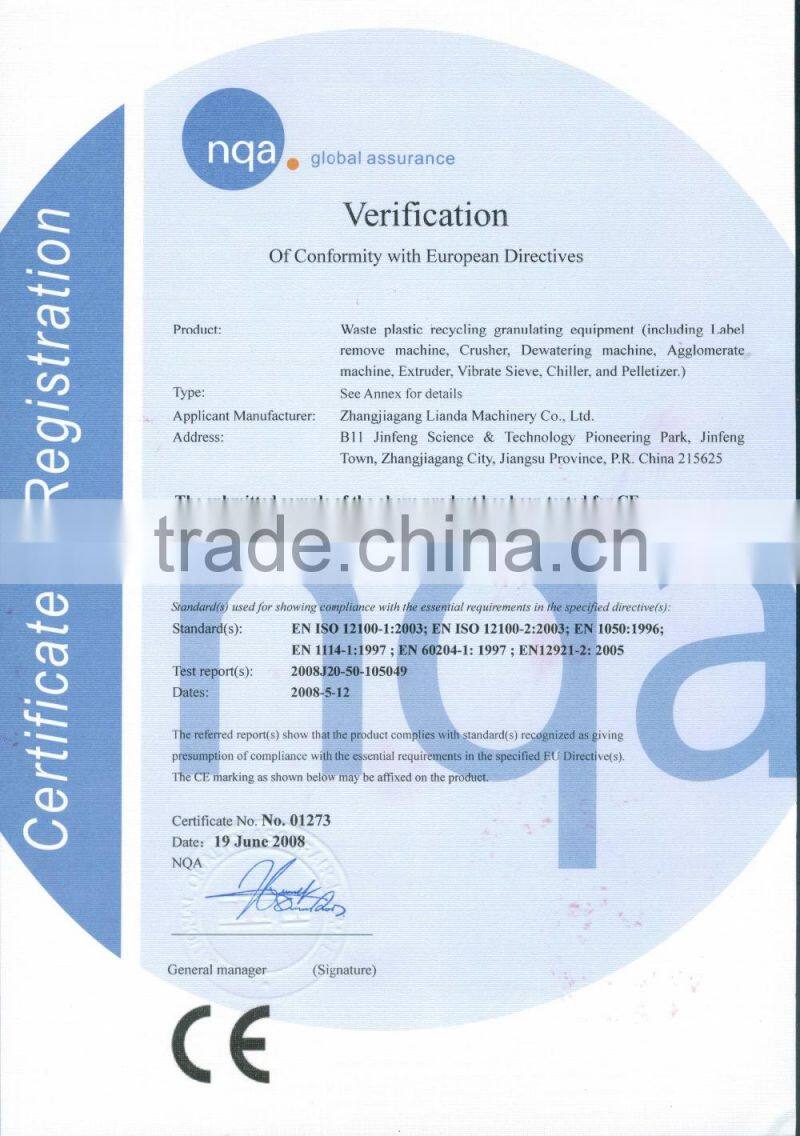 Zhangjiagang Lianda Machinery Co.,Ltd was founded in 1998. For over 18 years of experience in plastic recycling machine, we have dedicate to putting the innovations into practice to satisfy the needs of customer. Lianda Machinery specialized in plastic shredder, PET bottle/PE PP film washing plant design and planning, with CE/ISO9001/TUV certificate. Our equipment have exported to many different countries, such as Japan, Thailand, Korea, Mexico, Russia, Poland, Iran, Saudi Arabia and so on.