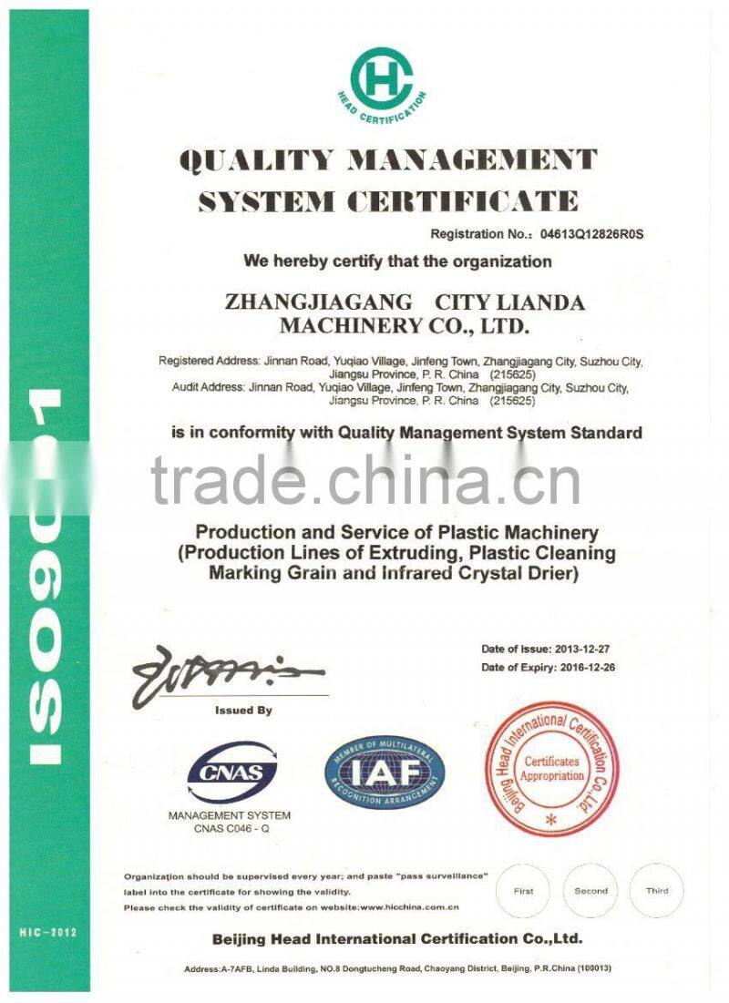 We import technology of PET infrared crystal dryer from Germany in 2008 and Lianda Machinery is the only manufacturer to offer this groundbreaking technology to this plastic processors in China.