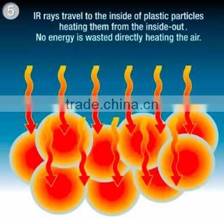 IR rays travel to the inside of plastic particles heating them from the inside-out. No energy is wasted directly heating the air.