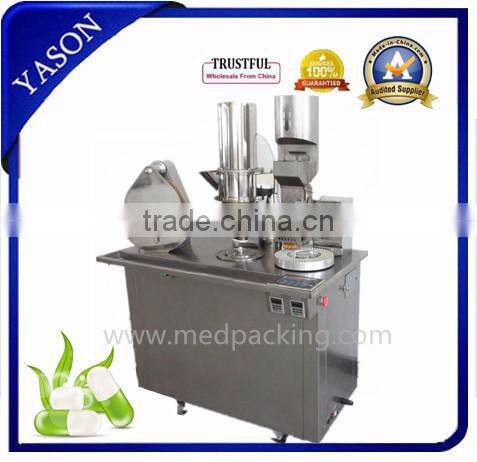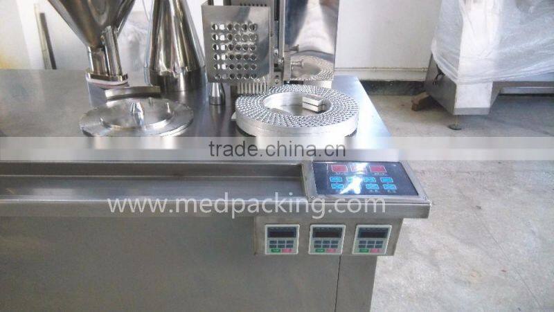 The machine consist of the separating mechanism for the capsule, carrying somersault, medicinal materials filling mechanism, systems of air-actuation control and electric equipment control, defender and other parts as well as the accessories of vacuum pump and air pump.