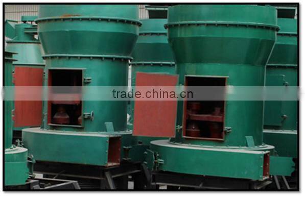 Firstly, raw material is crushed by jaw crusher to the size required, then elevated into a hopper from which the material is transported through the electro-magnetic vibrating feeder evenly and continuously into the grinding chamber for powder-processing. The rollers oscillate outward to press the ring because of the centrifugal force and the shovel scoops up the materials, send to the middle between the ring and rollers to accomplish the grinding. After grinding, the rough materials will be recycled by the air from the fan back into the grinding chamber for regrinding and the fine powders are blew into the cyclone and poured out through the output-powder pipe as the final products.