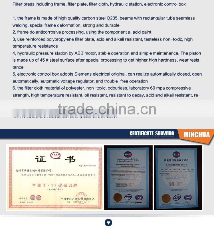 Enterprise passed the ISO19001-2008 quality system certification, the company production of "Ming hua" brand filter press, honor for "filter press in China top ten famous brand" title, henan quality credit AAA enterprise brand.The filter press sell well all over the country, and exported to the European Union, Russia, the United States, Australia, Brazil, Chile, South Africa, Uganda, South Korea, India and so on more than 20 countries and regions.Widely used in chemical industry, metallurgy, petroleum, pharmaceutical, sugar, food, coal, environmental protection and other industries, by the user's consistent high praise and praise at home and abroad.