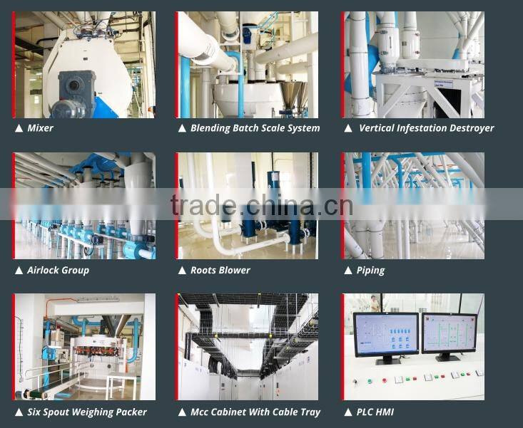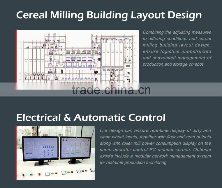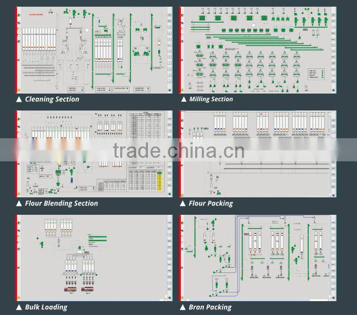 Complete set of wheat flour mill plant can be divided into four parts: cleaning part, milling part, packing part and PLC controlling part.