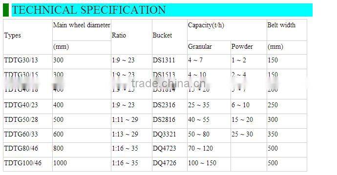 The machie is mainly used to vertical lifting cereals, oils, food, feed, chemical particles and powder materials. It is characterized by innovative design, convenient assembly, safe and reliable operation, small size, large output, good sealing performance, low noise and so on. The machine is also designed with anti-reversing machanism and bucket belt tensioning device, so is an ideal lifting machine until now.