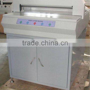 This paper cutting machine maximally cutting width is 650mm, and the maximally cutting height is 50mm, both pressing paper and cutting paper are full automatic.