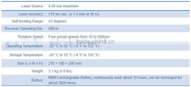 4.99 mw maximum Laser accuracy : ±10 arc sec. (± 1.5 mm at 30 m)