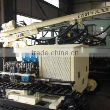 hydraulic drilling rig,adopt new-style hydraulic technique which have low air consumption,large rotation torque.the structure of the drilling rig is compact, During drilling the slide-skid are support on the ground to ensure the drilling has good stability.The usage of Z110 drilling rig has realiable property,high efficiency in drilling,the speed in hard rock is two times as the low air pressure drilling rig.
