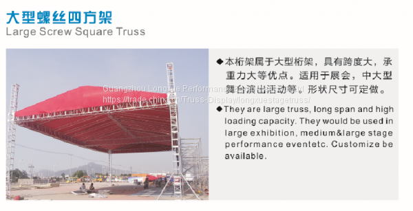 They are large truss,long span and high loading capacity.They would be used in large exhibition ,medium and large stage performance ect.Customize be available.