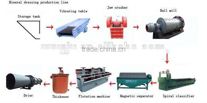 At first, ore is preliminary broken by jaw crusher. When it has been broken to a reasonable size, it will be send to ball mill symmetrical through bucket and feeder. Next, ball mill will crush and grand ore then go to next step- Classification.