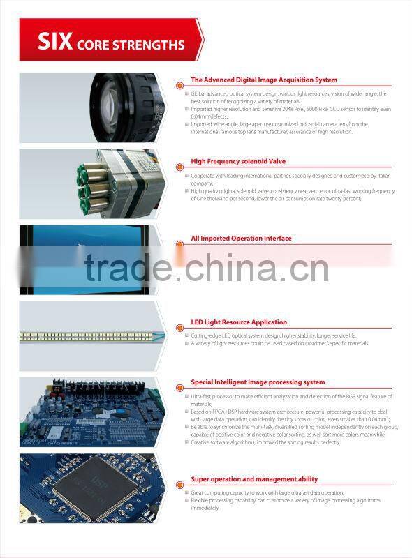 1. Mpored high-end 2048IPIEX CCD camera, can distingush infinitesimailspots which are less than 0.06mm2, glasses and resin etc, increase sorting impression to a higher level.