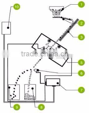 Input product is loaded into the in-feed hopper (1), it moves along the vibrating plate (2), until it flows on to a sloping chute (3), where it is individually checked at 360° and sorted by RGB-Full color cameras (4) . Depending on the signals received by the optical device, the sorter software controls the pneumatic device (6), which physically separates the unwanted products out of the conforming ones, which naturally reach their discharging hopper (8). The rejected products are instead deviated by a jet of compressed air produced by the relevant ejector and discharged in the front side hopper (9). In automatic resort versions, the sorted or rejected product to be conveyed to another section of the machine to undergo an identical process.