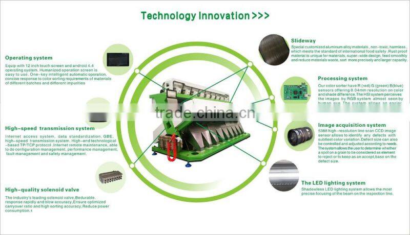 At present,our products include rice color sorter,grains color sorter,nuts color sorter,cereals color sorter ,beans color sorter, seeds color sorter ,tea color sorter, Color Sorters for Industrial products and Belt Color Sorter .Our products meet the demands of color sorting in many industries