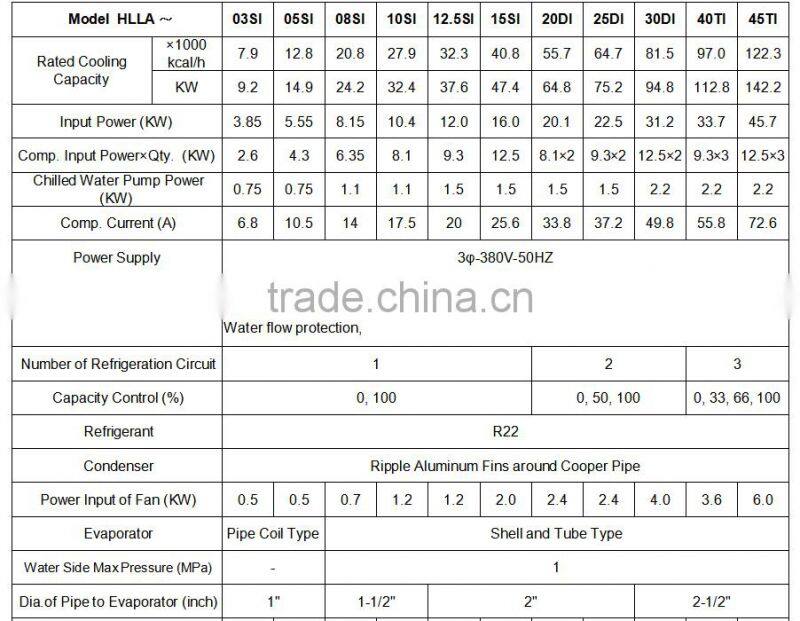 1. this type of chillers are made of superior compressor, so it is exllcellent in quality, noiseless, economical and durable. 2. the evaportors are shell and tube types, which are of excellent performace. 3. the cooling capacity covers a range of 9.2-142.2KW 4. it is compact-sized, with sufficent cooling capacity, and easy to clean. 5. water cooled Water chiller can be used in various feilds,such as chemical industry, medical industry, industrial processing, food processing industry,etc. 6. All-round safety protection: phase reversion protection, phase lack protection, overload current protection, discharge sir temp. protection, low&high pressure protection , low temp. protection, water flow protection 7. Refrigerant is R407C,R22,but R410A,R134A also available 8. Rated cooling capacity base: chilled water inlet/outlet temp.17 °C /12°C cooling water inlet/outlet temp. 30°C/35°C, fouling factor:0.088m2 · °C/KW. 9. Chilled water range: 5°C to 20°C; Cooling water range: 20°C to 40°C; |