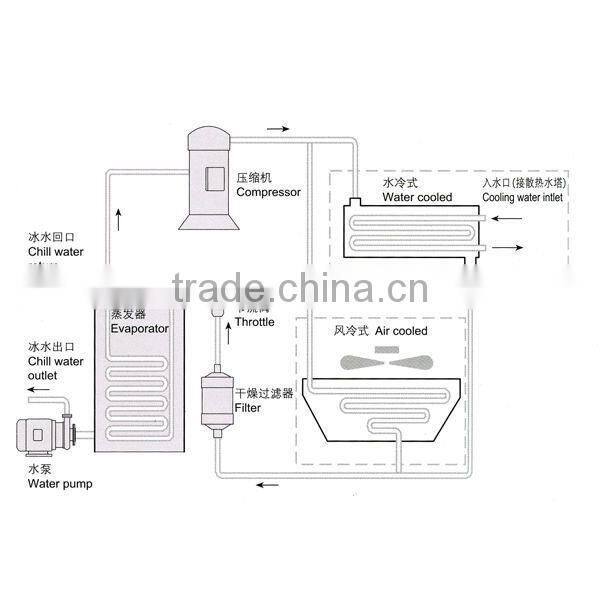 1. this type of chillers are made of superior compressor, so it is exllcellent in quality, noiseless, economical and durable. 2. the evaportors are shell and tube types, which are of excellent performace. 3. the cooling capacity covers a range of 9.2-142.2KW 4. it is compact-sized, with sufficent cooling capacity, and easy to clean. 5. water cooled Water chiller can be used in various feilds,such as chemical industry, medical industry, industrial processing, food processing industry,etc. 6. All-round safety protection: phase reversion protection, phase lack protection, overload current protection, discharge sir temp. protection, low&high pressure protection , low temp. protection, water flow protection 7. Refrigerant is R407C,R22,but R410A,R134A also available 8. Rated cooling capacity base: chilled water inlet/outlet temp.17 °C /12°C cooling water inlet/outlet temp. 30°C/35°C, fouling factor:0.088m2 · °C/KW. 9. Chilled water range: 5°C to 20°C; Cooling water range: 20°C to 40°C; |