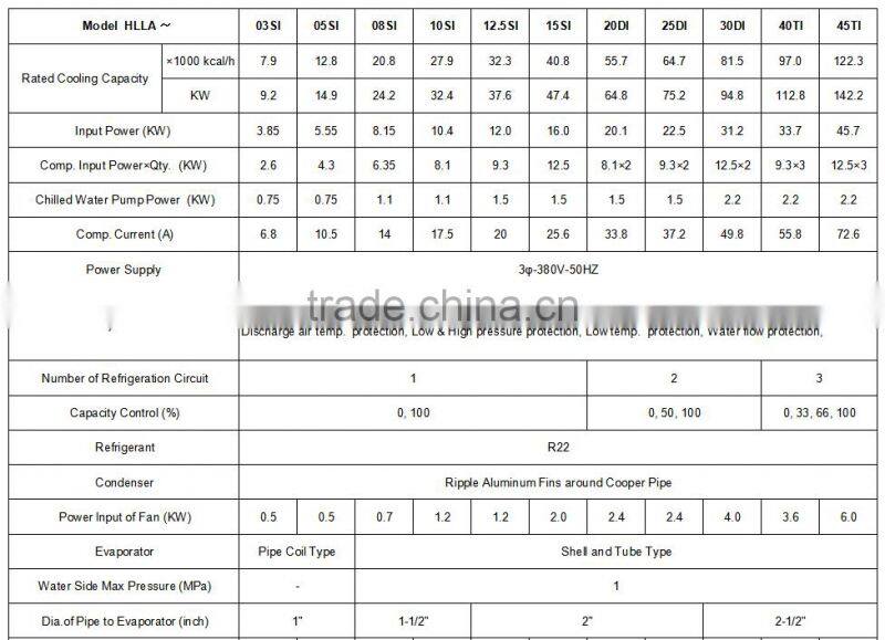 1. Made of superior compressor, so it is exllcellent in quality, noiseless, economical and durable. 2. the evaportors are shell and tube types, which are of excellent performace. 3. the cooling capacity covers a range of 9.2-142.2KW 4. it is compact-sized, with sufficent cooling capacity, and easy to clean. 5. water cooled Water chiller can be used in various feilds,such as chemical industry, medical industry, industrial processing, food processing industry,etc. 6. All-round safety protection: phase reversion protection, phase lack protection, overload current protection, discharge sir temp. protection, low&high pressure protection , low temp. protection, water flow protection 7. Refrigerant is R407C,R22,but R410A,R134A also available 8. Rated cooling capacity base: chilled water inlet/outlet temp.17 °C /12°C cooling water inlet/outlet temp. 30°C/35°C, fouling factor:0.088m2 · °C/KW. 9. Chilled water range: 5°C to 20°C; Cooling water range: 20°C to 40°C; |