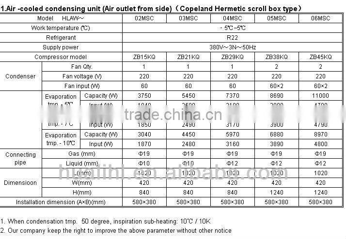 2.Unit Features 2.1 Attractive and beautiful outfit,configurated box appearance; 2.2 Equipped with Copeland Hermetic scroll compressor,low libration,less noise, reliable operation; 2.3 Featured with brass pipe and alunimiun fin to exchange the heat efficiently, longer product life; 2.4 Air outlet from the side condensing unit which equiped with 6- pole motor;and air outlet from the top unit which equiped with rotator motor, both of these two types make less noise. 2.5 Built-in electrical box, easily to connect circuits; 2.6 Safty valves assembled close to the connection pipe,convenient to install and maintain. 2.7 Unit can use R22 and R404a