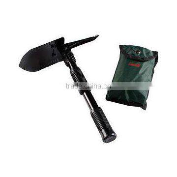 FEATURES Durable ed steel blade and pick: 1 Folds down to 6.75: 2 Comfortable rubber grips: 3 Twist lock securely fasten pick and shovel blade in place: 4 Black nylon carry pouch: 5ATTRIBUTES Carry System: Nylon Bag Special Features: Twist Lock Securely Fastens Pick And Shovel Blade In Place