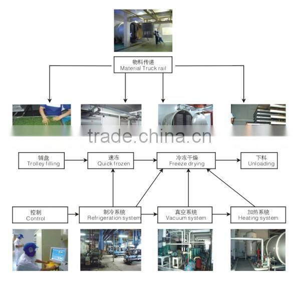 FDG series lyophilizers are consisted of food pre-freezing system, freezing and drying pot, heating system, vacuum system, refrigerating system, material conveying system and control system, etc.