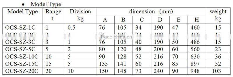 OCS-SZ digital wireless crane scale is composed of two parts, a scale and a force indicator. The scale uses a patented high precision resistant-strain transducer and employs a reliable force transfer structure. Combined with the multi-function intelligent indicator, the weighing system is very capable for application in specified range of weighing operation.