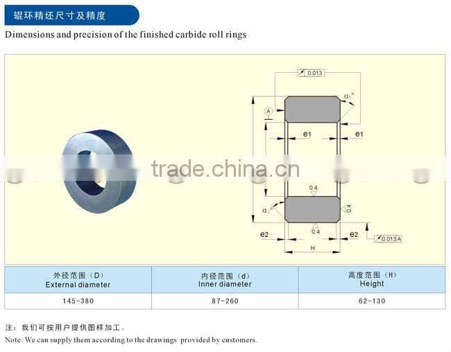 At present, we can make mass production in diameter ≤ 380mm, thickness ≤ 130mm roll ring. Our carbide roll ring can meet demands of small steel and rods, wire in rolling, pre-finishing, finishing mill.