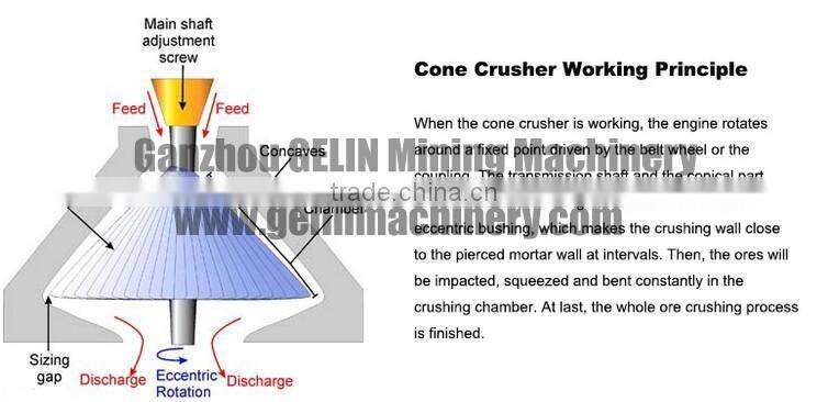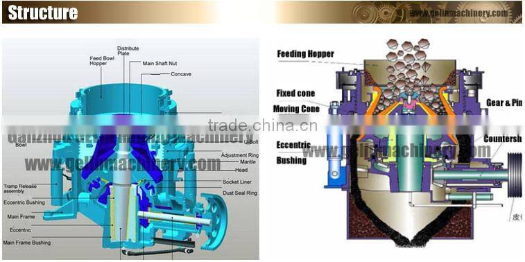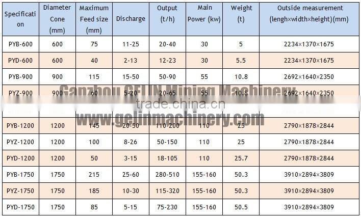 apply to crush the medium-hardness of various rocks and minerals. Simple structure, high production efficiency, easy adjustment, the use of economic and other characters. Patterns of broken cavity are decided by ores use. the standard type (PYB) apply in medium fine; medium (PYZ) apply in the medium-fine crush short-head (PYD) applicable to the fine crush.