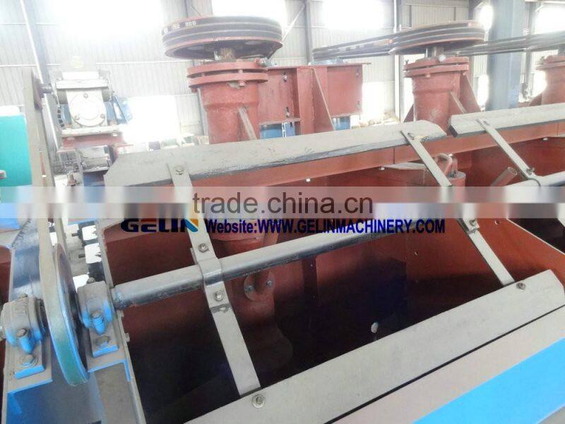 Flotation machine is applicable for the separation of nonferrous metal and ferrous metals, such as fluorite and talc. The impeller is driven by V-belts, which can bring the centrifugal effect to form negative pressure. While extracting sufficient air to mix with ore pulp, the machine stirs ore pulp and mixes it with chemicals to form mineralized froth. By adjusting the height of the flash board to control the liquid level, the useful froth can be scraped from the loam board. The height of the strobe must be adjusted carefully to keep the stabilization of liquid level and scrape the mineralized froth to the launder. The impellers and stators should be kept at a distance and should be changed when worn. The bearing in the pump should be maintained every three months.