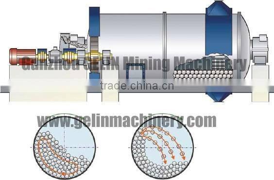 The centrifugal force caused by rotation of barrel brings the steel balls to a certain height then impact and grind the materials.