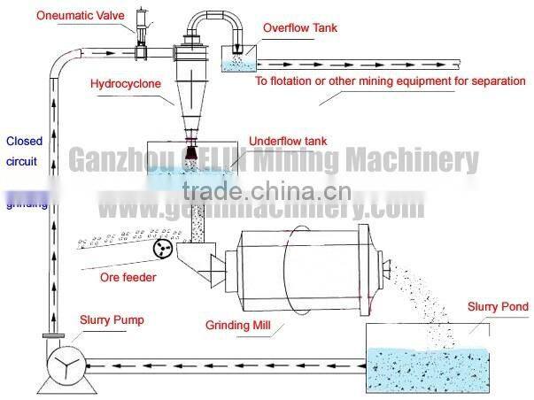 Hydraulic cyclone is widely used in concentrator of nonferrous and ferrous, chemical, pharmaceutical, ceramics and other industries. It is mainly applied to the process of second paragraph grinding, coarse or concentrates re-grinding and the closed-circuit composed by mechanical grading machine, its grading operation is according to the particle size.