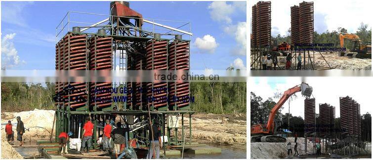 This equipment is one of the gravity concentrators, which separate minerals of different specific gravity according to their relative movement in response to gravity, centrifugal force and other forces in the fluid medium. It has extremely good performance and effects in processing placer of beach, riverside, seashore and stream. Desen spirals separator are made of polyurethane lined fiber glass with wearable corundum inner surface. Generally there are 5 turns in one start, single, twin, triple and quad starts available per column to suit capacity requirements.