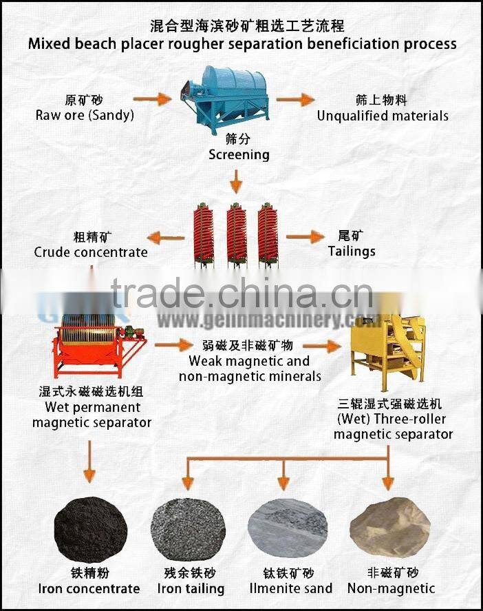 Mixed beach placer is variety of mixed ore minerals, it should separate mineral step by step though the gravity separation, wet magnetic separation, dry magnetic separation, electric separation. Then we will get ilmenite, monazite, Tin sand, rutile and zircon sand, Iron ore and other finished products, that all have a very high economic value.