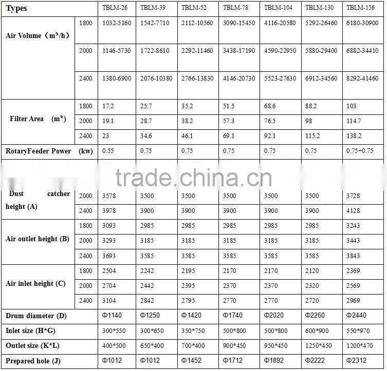 Technical specifications of TBLM-series Low-pressure Pulse Dust Catcher