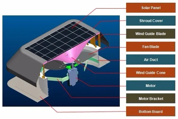 Our solar attic fan is axial type ventilation fan, for air exhausting & heat removing. The fan is mounted on the roof, it starts working instantly when sun shines. Totally solar powered, No manual operation, No maintenance!