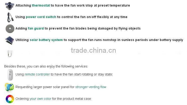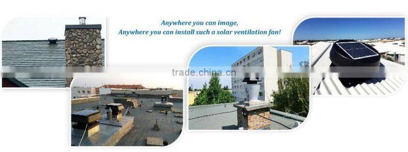 The initial installation purpose for such solar roof exhaust fan may be to take out heats from a residential house, and they have been widely used in pitch roofed buildings like villas.