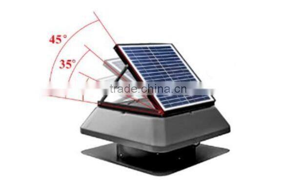 This roof exhaust fan carries a horizontal adjustment platform design for the solar panel to rotate left or right and face towards the sun, this rotation can be as big as to 90°.